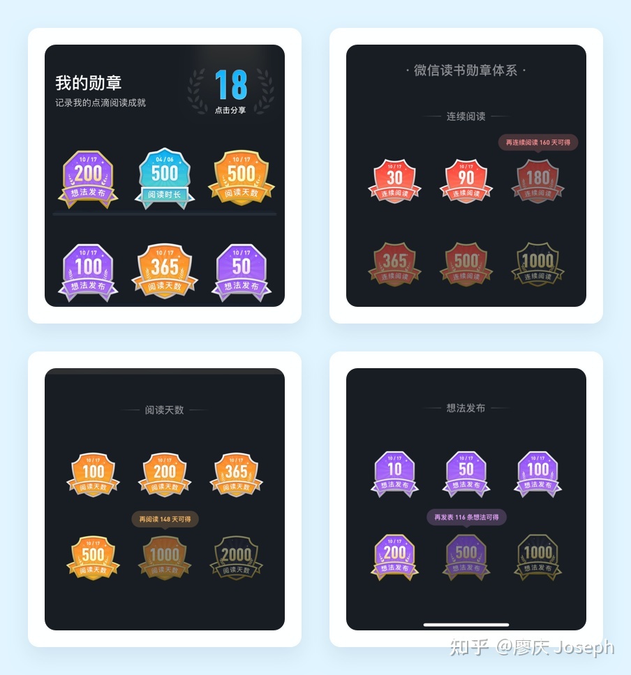 微信读书的勋章体系非常丰富,包含了【连续阅读】、【阅读时长】、【阅读天数】、【阅读书籍】、【读完书籍】、【收到的赞】和【想法】发布七大类型,充分激发用户读书兴趣,留存用户,培养用户习惯。
