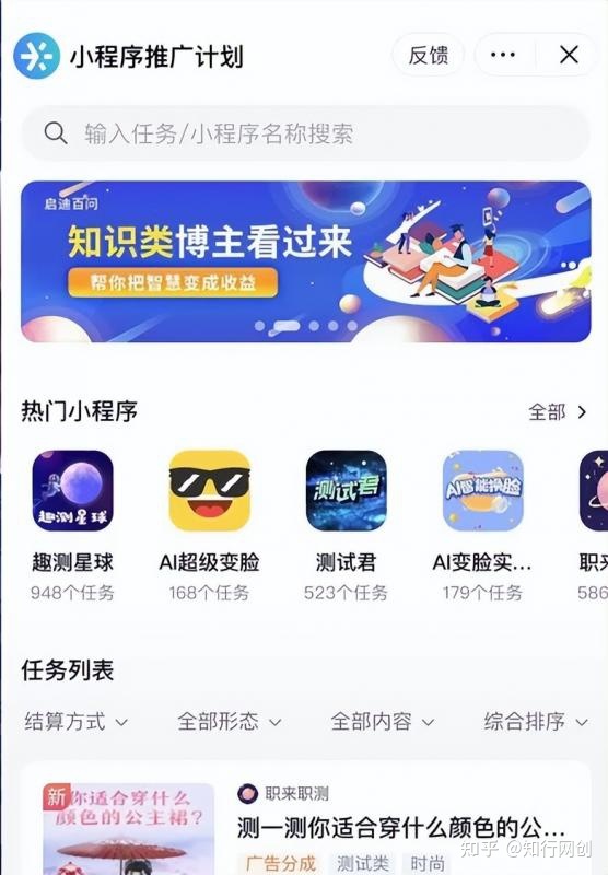 小程序推广的入口很简单,只需要在抖音的上方搜索框搜索小程序推广计划就可以看到小程序推广计划的入口,进入到小程序推广的界面以后就能看到非常多的任务,所以你也不用担心说任务量不够或怎么样的