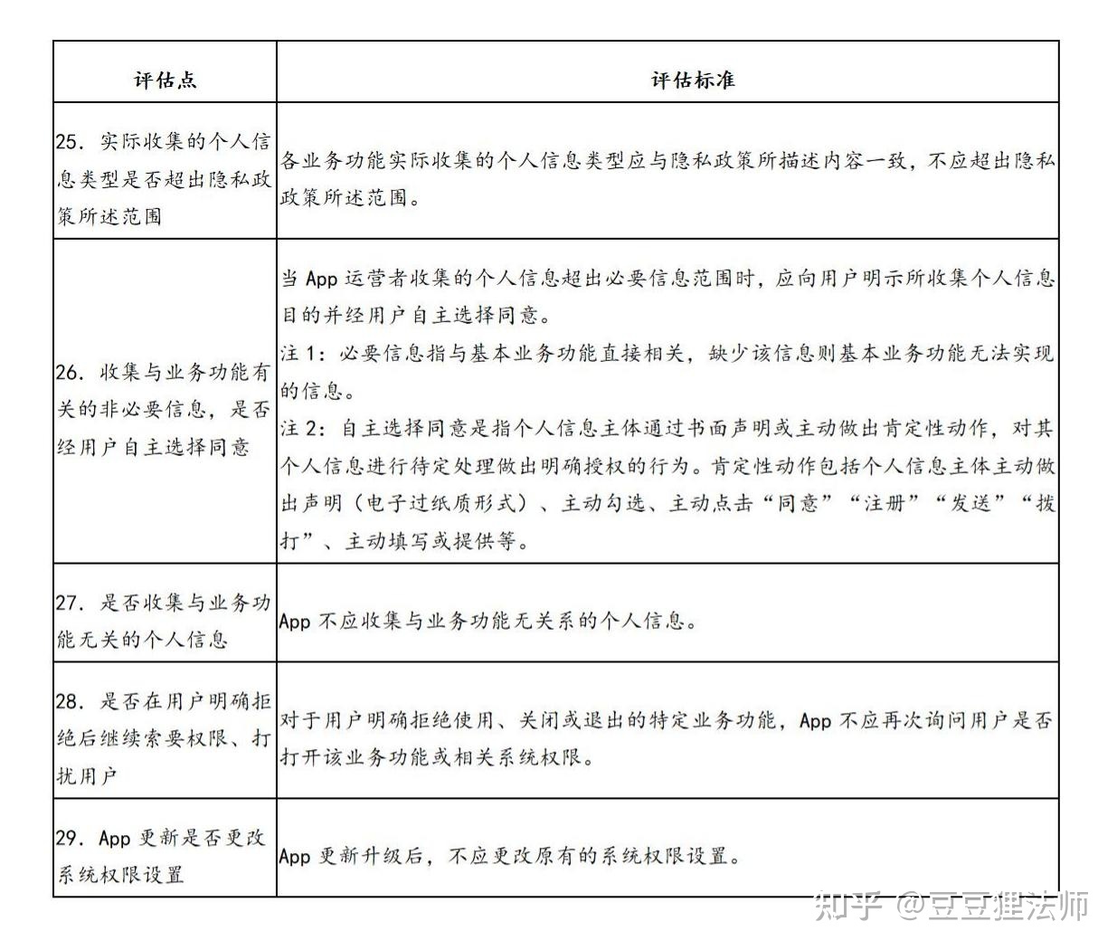 其次,国家互联网信息办公室、 工业和信息化部、公安部、国家市场监督管理总局还成立了“App违法违规收集使用个人信息专项治理工作组”联合开展App违法违规收集使用个人信息专项治理工作。该工作组制定了《App违法违规收集使用个人信息自评估指南》(2019年3月3日发布并生效),用于App运营者对其他收集使用个人信息的情况进行自查自纠,该指南第7项规定了“收集个人信息应满足必要性要求”的评估点和评估标准,具体如下。