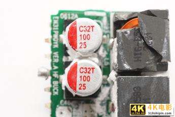 二次降压小板正面一览,降压电感和固态电容成对布置。其中一颗电感因为拆解过程中用力过猛破损。