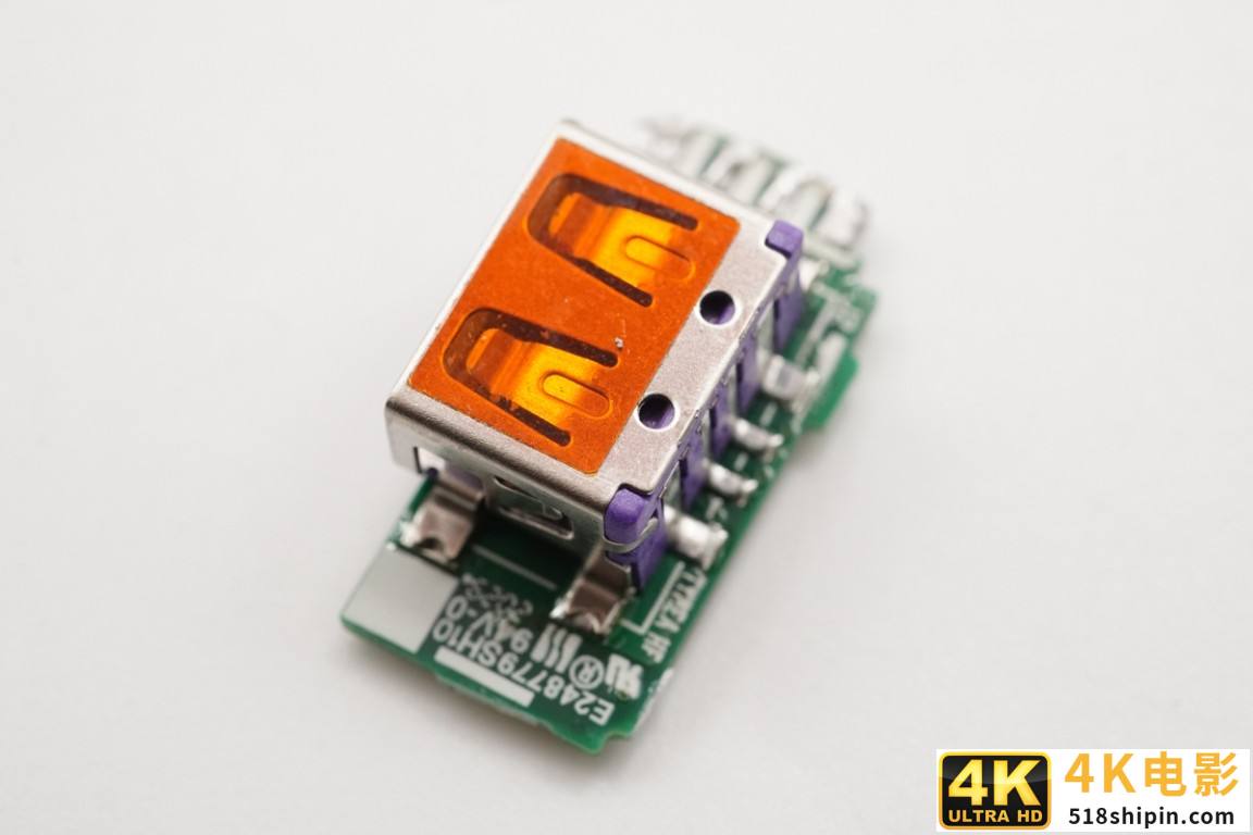 USB-A母座和小板之间设有紫色隔离板,舌片外侧两根针脚加宽设计,以便大电流通过。