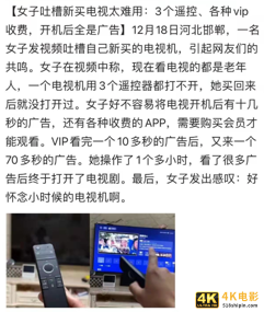 近期,有一位用户在网上吐槽新买的电视太难用:3个遥控器、开机后全是广告、各种VIP收费、购买会员,“好怀念小时候的电视机啊。而这也是目前互联网智能电视为人诟病的几个槽点。”