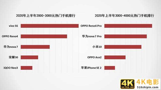 新品发布数量反映了手机厂商对于市场发展趋势的精准捕捉。2020年上半年华为、OPPO、vivo、三星、小米等品牌均有旗舰产品推出,苹果也突击上线新一代的iPhone SE,占领3000元档位市场。