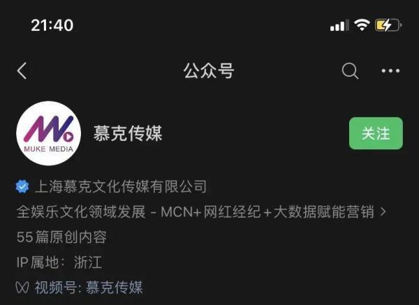 根据上海慕克传媒官方微信公众号发表的公司介绍,慕克传媒于2019年10月在上海成立,并先后于杭州、成都、温州设立分公司。公司定位全娱乐文化领域发展,旗下签约的网红/自媒体达人/艺人活跃于各大短视频、直播、社交媒体平台,还与国内外多家文娱企业、互联网企业以及知名品牌保持长期合作关系。