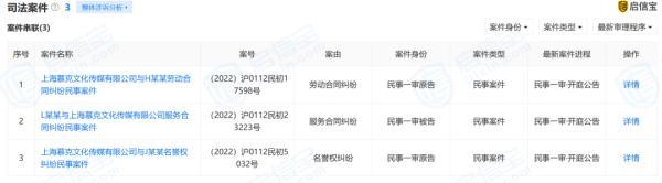 启信宝显示,上海慕克还多个纠纷,案由分别为劳动合同纠纷、服务合同纠纷以及名誉权纠纷等。