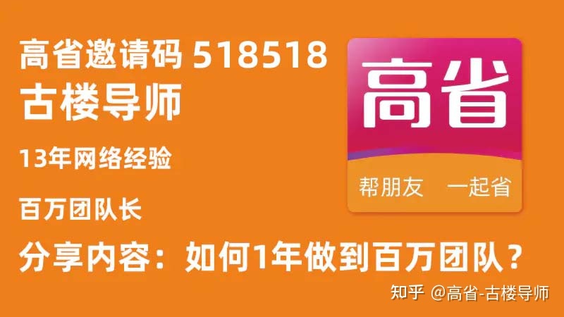 高省APP佣金更高,模式更好,终端用户不流失。【高省】是一个自用省钱佣金高,分享推广赚钱多的平台,百度有几百万篇报道,也期待你的加入。古楼导师高省邀请码518518,注册送2皇冠会员,送万元推广大礼包,教你如何1年做到百万团队。