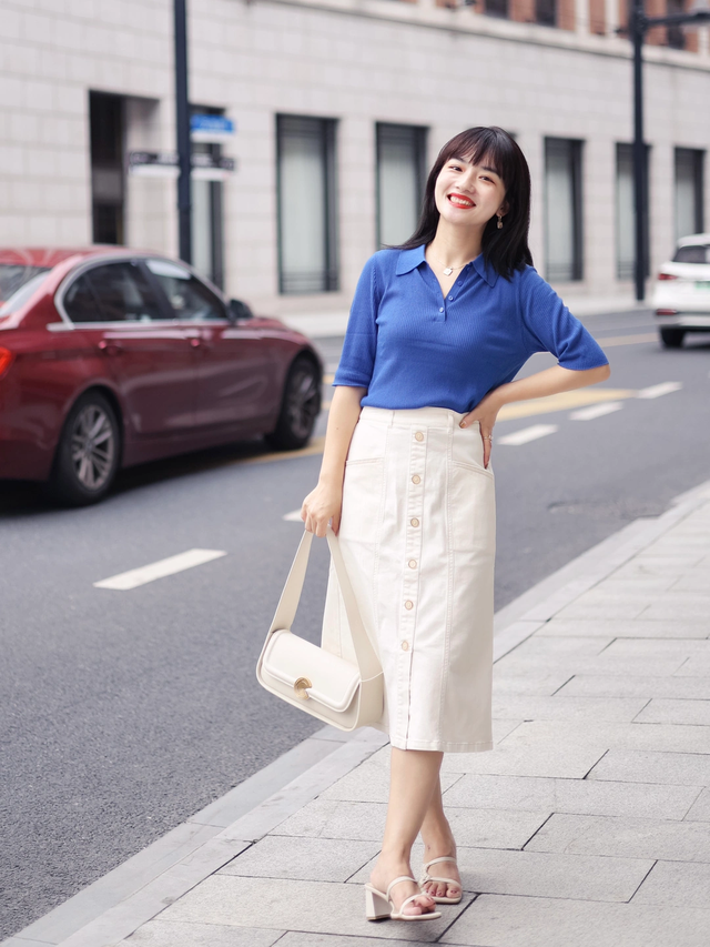 如果担心过于正式的穿搭显老气,那么可以适当的用彩色单品来营造氛围感,比如蓝色的polo衫搭配白色的直筒裙,颜色的观感就非常清爽时尚,同时又具有很强的通勤风。
