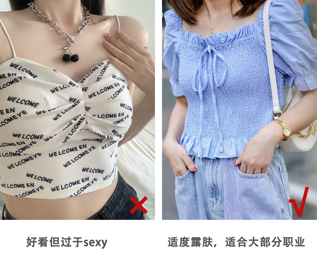 但露肤的程度也需要把控好,尤其是下装,裙子的长度至少要到膝盖附近,太短了就显得轻浮,而且也有走光的风险。