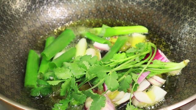 第三步、中火慢炸,让食材的香味完全融入到油里面,一直炸到食材焦黄之后,捞出食材留油。