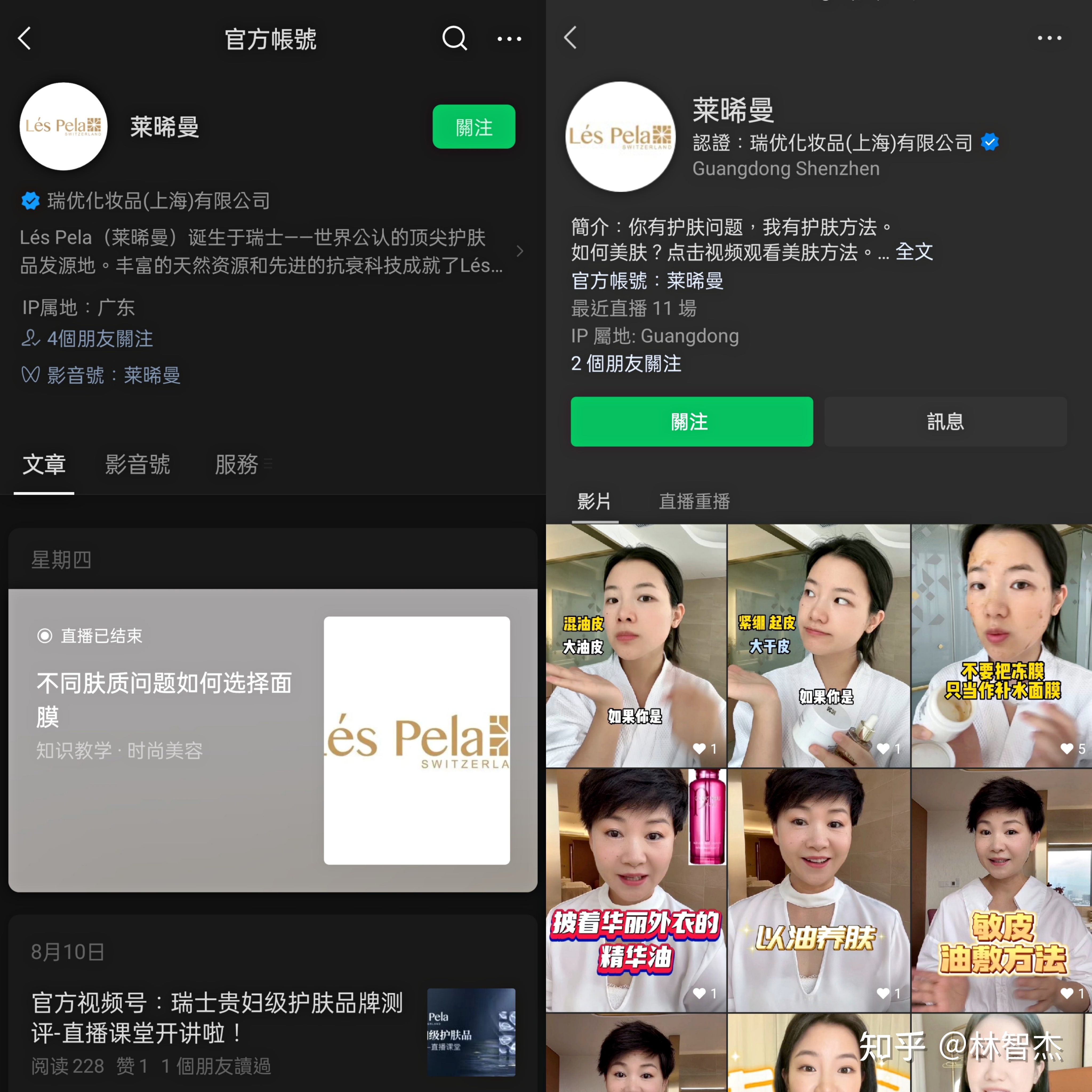 品牌会通过公众号推文及视频号的渠道进行传播,公众号采用传统定时更新的节奏发表图文,多为节日问候或品牌活动宣发;而视频号则通过视频内容、直播的方式,进行知识分享、产品推广及护肤问题在线答疑。