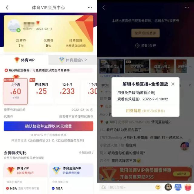 据了解,腾讯拥有大陆NBA独家直播权,腾讯体育会员可以免费看8场比赛,资费为30元/月,超级会员88元/月,可解锁所有比赛和回放。目前,腾讯体育会员体系与视频号并不互通。