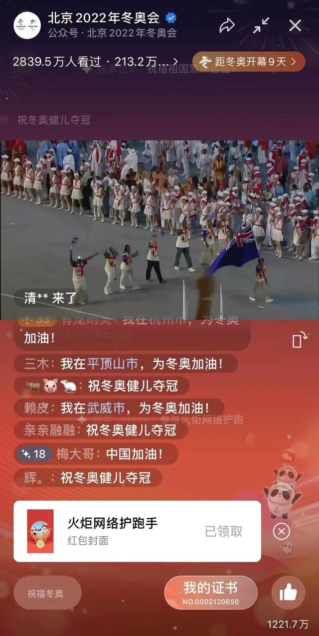 进入“北京2022年冬奥会”的视频号直播间,用户可以点击“我的证书”,获得一张带有官方认证编号的“北京2022冬奥会火炬网络护跑手”荣誉证书,并将证书直接设为微信状态背景图,设置成功后显示状态为“护跑火炬”,微信名称后缀会出现小火炬图标。