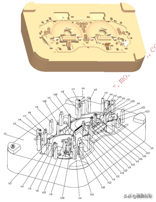 2)型腔类零件(定模)以V1、V2、V3……,顺序排布;