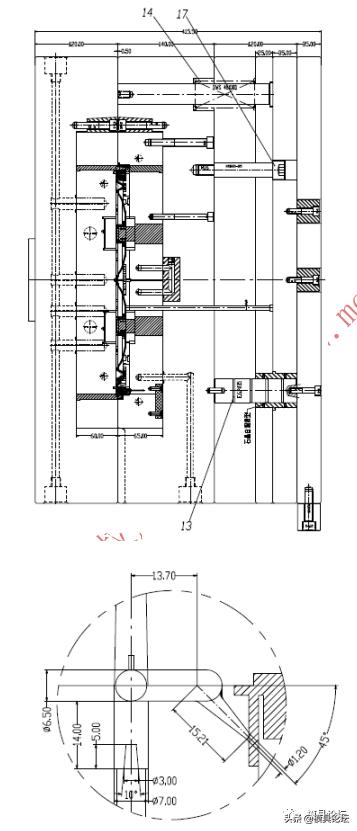 塑件的顶出系统采用顶针和司筒顶出。为了使顶出系统顺畅,做了一些创新性设计。设计了中托导柱13,用石墨中托司导向,中托导柱13顶部用定位销固定在B板背面,底部用螺钉固定在动模底板上。这种中托导柱设计的导向性能最佳,克服了传统中托导柱与顶针板垂直度差的弊端。同时中托导柱13也可以起到撑头的作用。为了装模方便,在回针的端面设计了M10螺纹孔,便于收紧顶针板,同时在顶针板设计了限位螺钉17,撑头11和撑头12的顶部均设计了定位销。顶针全部采用日本MISUMI高速钢顶针SKH51。