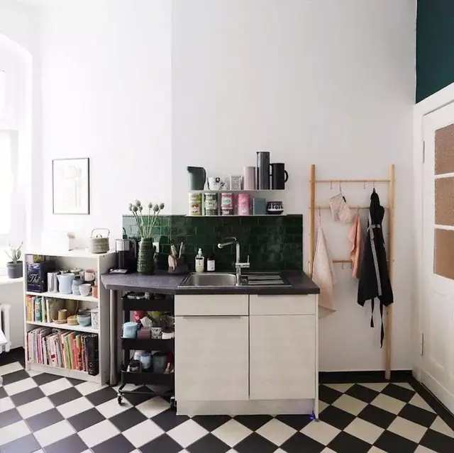 厨房不能乱糟糟,也不能单调,公寓主人选择了绿色。虽然没有用更好看的花砖,但半墙的绿色瓷砖,只在橱柜上下柜之间露出了半米左右的高度,就已经让人过目不忘。