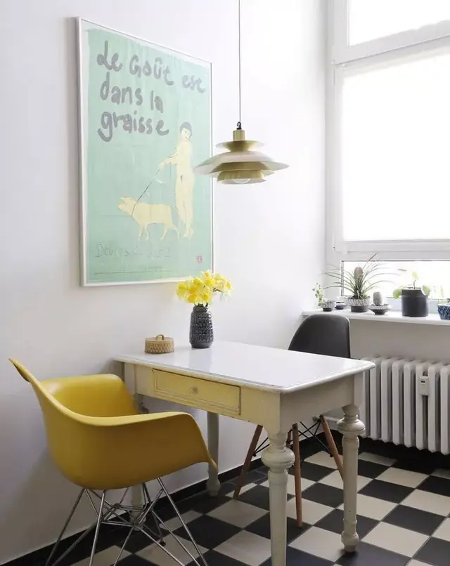 我最喜欢的是厨房的小餐桌,黑白地砖、白色餐桌、伊姆斯椅、金色的吊灯,还有挂画,就形成了厨房里“完全独立”的一个小空间。