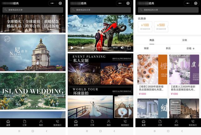 除了服务预订类小程序外,商家也能做电商云名片小程序,以实现信息展示、策划方案详解、案例展示、定制婚礼、下单、在线沟通等多种服务。比如下图这个婚纱婚庆小程序案例,就在首页通过多个图片banner,以轮播图形式展示了高质量的婚庆案例,并且用视频来详细宣传自己的婚礼定制服务,看起来非常高大上。