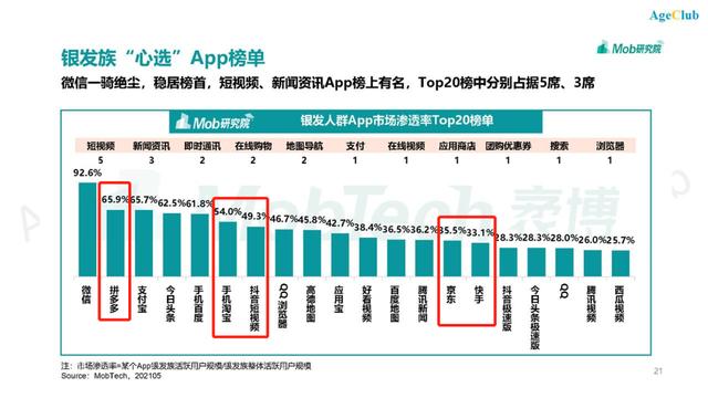 在前文提到的Mob研究院《2021年银发经济洞察报告》中,抖音短视频在银发人群中的渗透率仅次于手机淘宝,快手则仅次于京东。