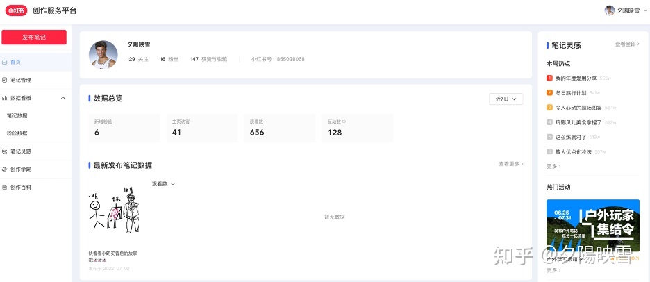 这个是我自己的账号,进去以后我们能够看到很多后台数据,笔记数据,粉丝数据等等。