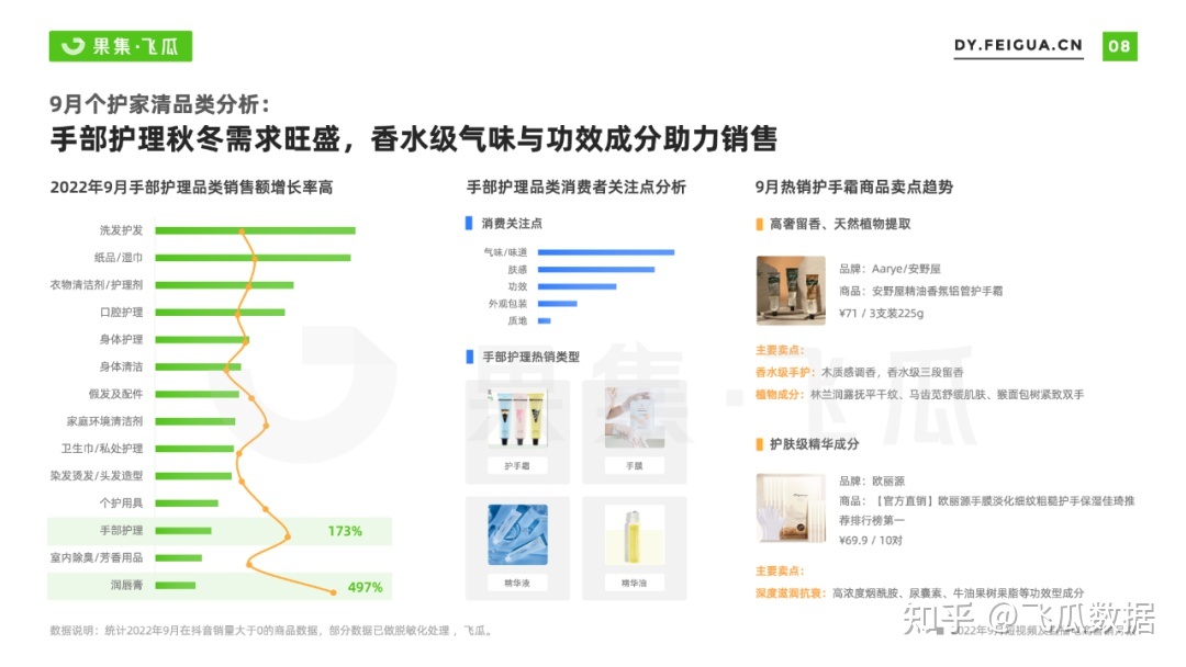 进入秋冬,皮肤开始出现干燥情况,护手霜、身体乳等滋润产品逐渐成为刚需;此外,静电问题也让用户倍感困扰,因此有防静电效果的衣服柔顺剂、秋冬四件套以及室内加湿器也将迎来热卖。