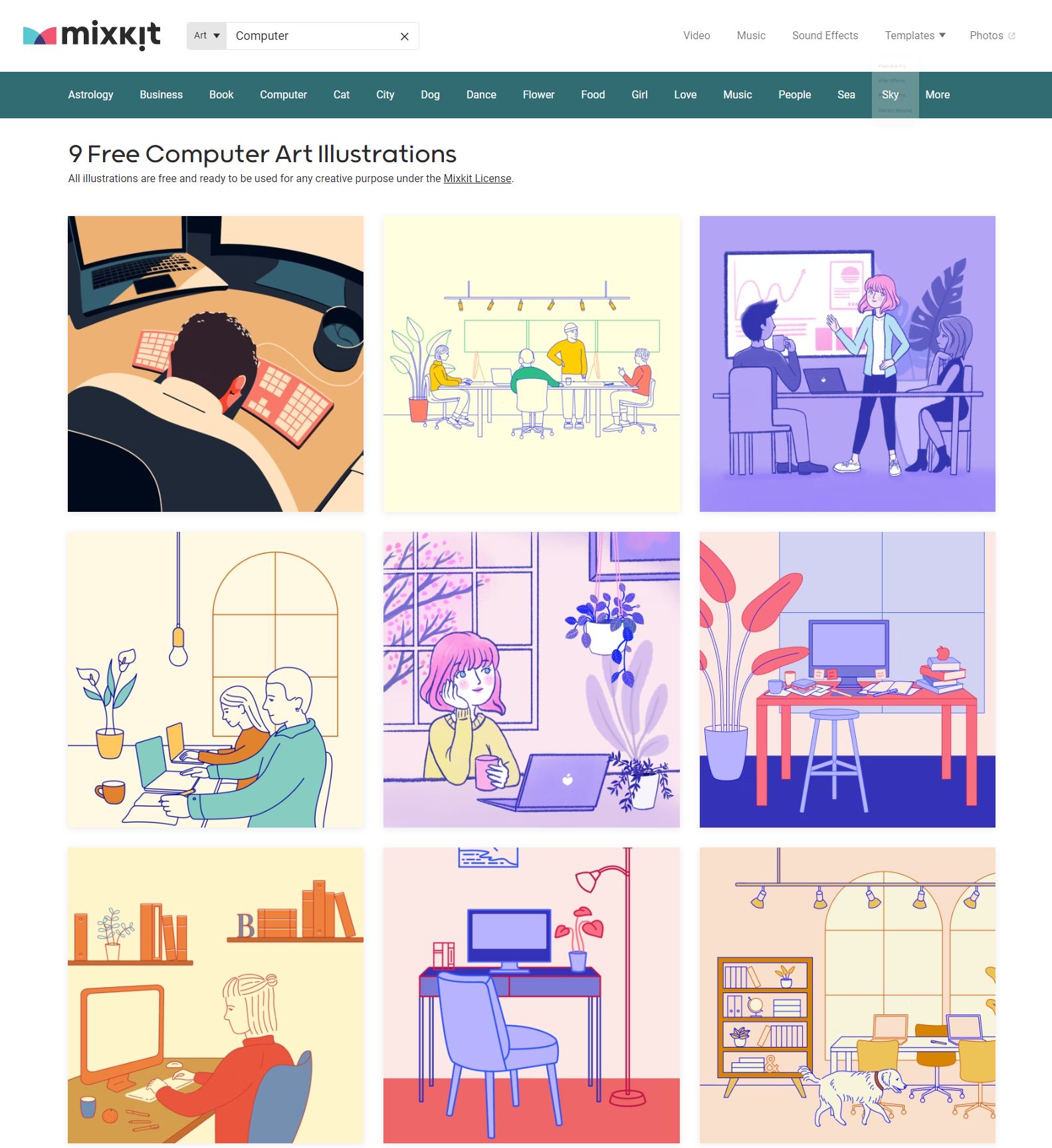 Mixkit art 是Mixkit推出的插画素材库,这里面插画质量很高,配色也很绝,按板块分类,能便于搜索,可以一键下载。