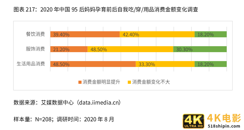 数据显示,孕育后,多数95后妈妈在食物以及用品方面,为自己的消费金额较孕育前增加较多,尤其在用品领域,孕育后消费金额明显上升的受访者比例占48.5%。
