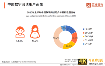 iiMedia Research(艾媒咨询)数据显示, 在线阅读用户呈现出分散化特征。男性用户较多,达54.3%。26-45岁用户是数字阅读用户主力,总占比达60.0%。
