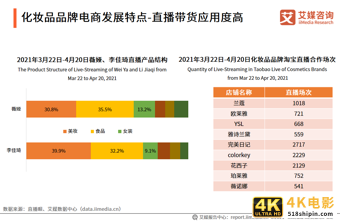 iiMedia Research(艾媒咨询)数据显示,2020年上半年,商家体验过直播带货模式比例TOP4行业分别是化妆品、服装、食品和家居饰品,其中化妆品行业以66.7%的比例排名第一。淘宝头部主播薇娅与李佳琦近30天内的直播中超过30%是美妆类产品,国内外头部化妆品品牌的天猫旗舰店合作直播次数平均较高。
