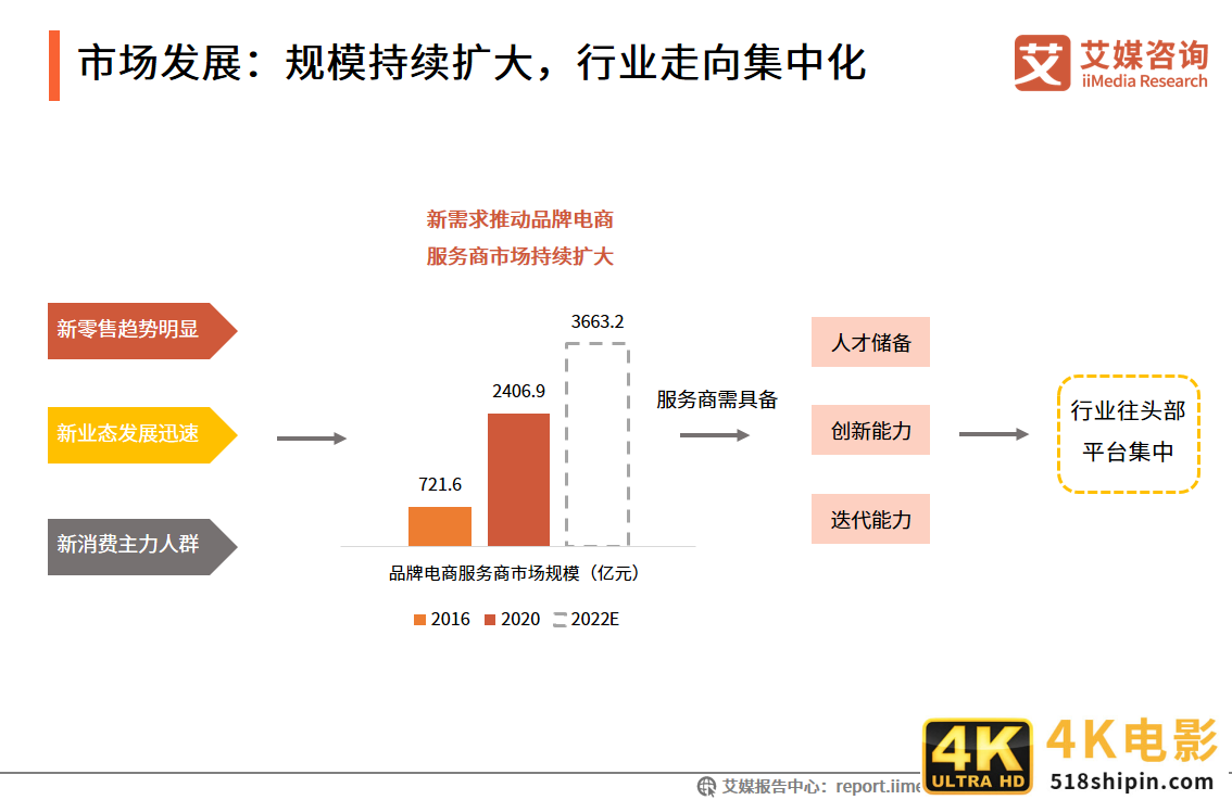 艾媒咨询分析师认为,虽然发展时间较长,但中国品牌电商服务商市场仍处于成长期,市场规模持续扩大。这主要由三方面因素驱动:一是中国电商产业成熟,新零售趋势明显,品牌方数字化转型以及在线上渠道寻求突破的需求增加;二是新兴电商业态发展迅速,品牌方需要适应新的线上竞争环境;三是主力消费人群更新迭代,品牌方需要更好应对客户需求变化。面对高速增长和变化的市场需求,人才储备、技术创新能力等对于品牌电商服务商的竞争力都有重要影响,因此专业的服务商更受客户信赖,行业也将进一步分化,往头部集中。