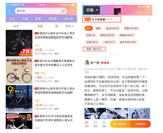 在淘宝搜索结果下,筛选条件“销量”被单独放出,在商品下面有“问大家”和评论分类筛选功能,大销量、快速查看商品整体评价、询问已购买消费者,这些都在帮助消费者规避风险,得到真实商品信息。