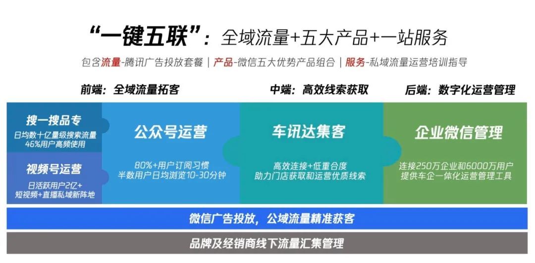 所以,一键五联最核心的事情,是连接、助销与提效。在前端通过月活跃用户12.1亿的微信和6.17亿的QQ,在公域流量通过效果广告建立精准的触达,同时利用视频号、公众号、搜一搜等产品能力运营并拦截自己的私域流量,做基础的商机培育;在中端通过车讯达平台的车型展厅,筛选收集高意向线索,并确保线索具备唯一性;在后端通过企业微信为导入流量提供私域服务的平台与助销工具,持续维护转化潜客,实现车主再运营。