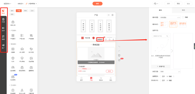 4. 预览并确定好小程序商城模板后,对其进行设计编辑。图片、文字内容、功能模块、页面、页面中的控件等都可进行编辑修改,直接点击页面中要修改的内容或左边的功能选项就可进行编辑设置。