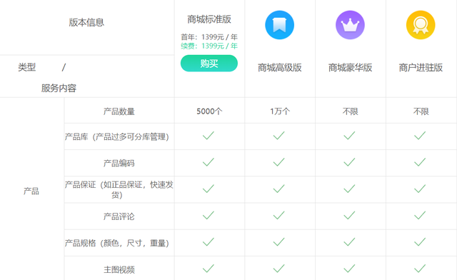 5、 在来看看各版本覆盖的功能,企业需要根据自身情况,开通版本。比如产品功能,下图可以看到,标准版支持上传产品数量,和高级版,豪华版各有不同。