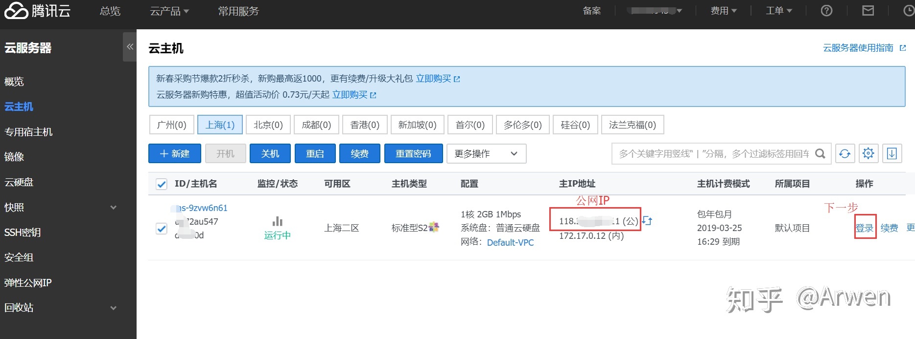 购买完成后,进入控制台中的云主机就可以看到服务器的公网ip,点击右侧的登陆按钮(账号密码都在站内信里)即可登陆购买服务器的操作系统。