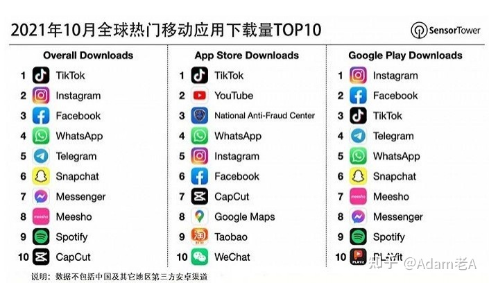 早在2021年,Tik Tok已成为全球下载量最大、收入最高的非游戏类手机APP,总下载量超出30亿,远超Facebook。