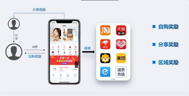 分享购模式核心是裂变机制跟分润机制,消费者通过平台跳转到别的地方进行消费,如购物,点外卖,充话费等等,可获得折扣。团队方面则可获得分润。不用改变消费者习惯,去除用户抵触心理,对接CPS资源越多,平台能触达的用户也就更多。折扣与佣金,有足够的噱头吸引消费者。