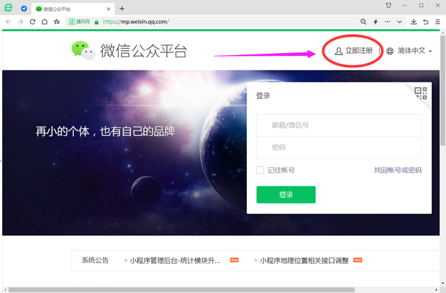 1、在电脑浏览器上打开微信公众平台官网,点击立即注册;