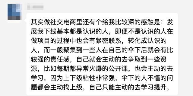 我参与体验了社交电商项目,加入了他们的群,氛围极好,比如只要有人在群里问关于业务上的问题,立马就会有很多其他群友站出来义务的帮忙回答问题,形成这样的氛围全倚仗于社交平台的关系链和利益链这两条链建立的人和人之间的关系。
