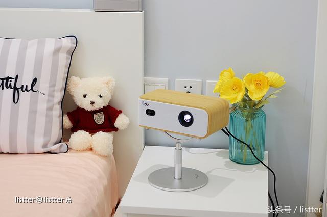我在倾斜着放在床头柜上神画Q1而投射出的画面,观影位置在床上正中央位置,这时候画面居然还能保证完全正面朝向我,画面十分方正(请原谅我拍照的相机广角端有畸变,实际上投影效果非常给力)。